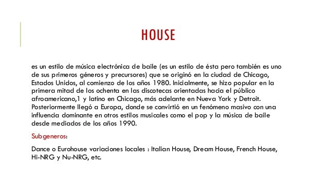 House, Dream House, French House, Hi-NRG y Nu-NRG, etc.