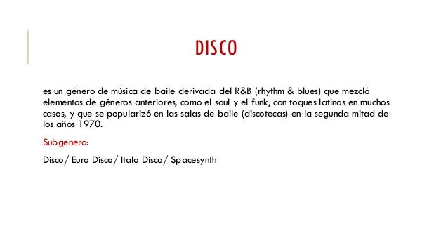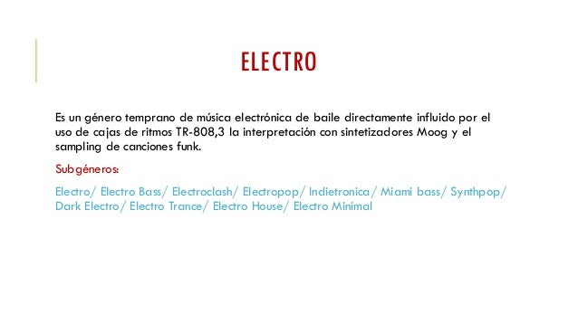 electrónica, como el house, trance, eurodance, italo-disco, drum and bass, el