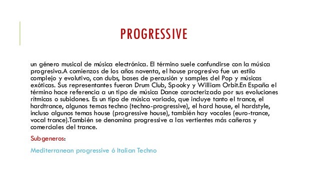 de música electrónica. El término suele confundirse con la música progresiva.A
